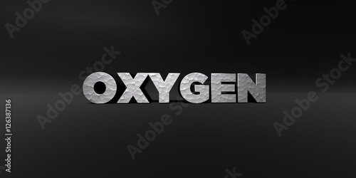 OXYGEN - hammered metal finish text on black studio - 3D rendered royalty free stock photo. This image can be used for an online website banner ad or a print postcard.