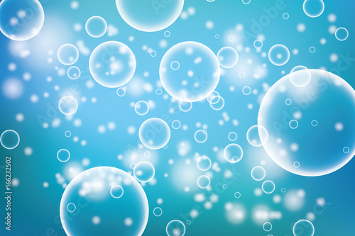 Oxygen bubbles in water blue background for scientific and biological concepts. Transparent circle, sphere ball, water sea or ocean, vector illustration
