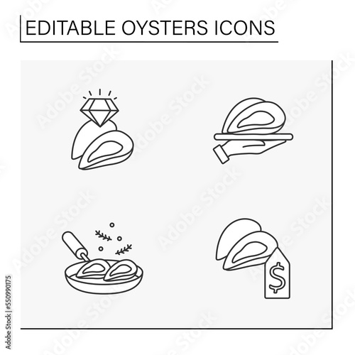 Oysters line icons set. Tasty and luxurious food from the restaurant. Organic aphrodisiac. Seafood concepts. Isolated vector illustrations. Editable stroke