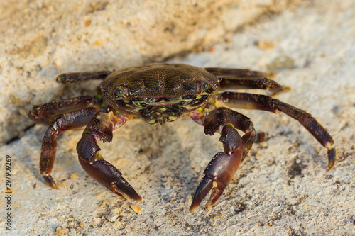 Pachygrapsus marmoratus is a species crab, sometimes called the marbled rock crab or marbled crab. Black Sea. Crab in the stones.
