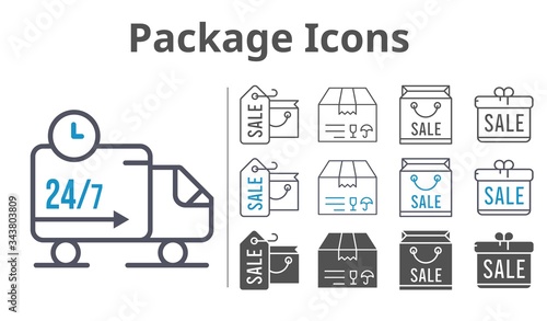 package icons icon set included gift, shopping bag, package, delivery truck icons