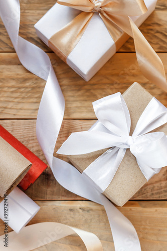 Packed boxes with gifts and paper and ribbons for packaging on a wooden background. Gift wrapping concept. Gifts for the holiday. Christmas gifts. New Year's greetings. Birthday gifts.