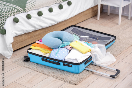 Packed suitcase with beach accessories in bedroom. Travel concept