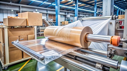 Packing paper getting wrapped by plastic machine, packaging, manufacturing, production