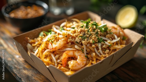 Pad Thai with fresh shrimp served in a beautiful paper food cup. The bright colors of the food plate emphasize the delicious and authentic taste of Thai food.