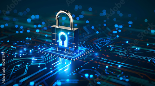 Padlock icon on top of an electronic circuit board symbolizing security in cyber space