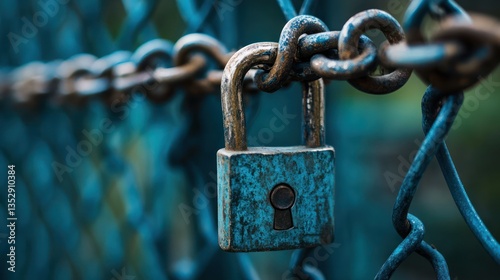 Padlock secured chain-link fence outdoors, blurred background. Security concept