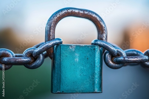Padlock secured on a metal chain in a peaceful outdoor setting during golden hour