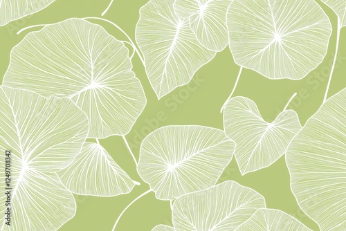 Padrão contínuo (seamless pattern) de folhas estilizadas em tons de verde com linhas delicadas em branco, criado com IA generativa.