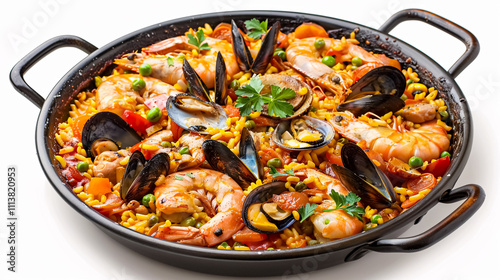 Paella: Spanish paella with saffron rice, seafood, chicken, and vegetables on a white background.
