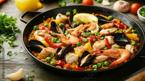 Paella with seafood, chicken, and vegetables in a traditional pan with a lemon wedge. Emphasizing vibrant and savory nature, ideal for Spanish cuisine and festive meals with a lively presentation.