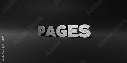 PAGES - hammered metal finish text on black studio - 3D rendered royalty free stock photo. This image can be used for an online website banner ad or a print postcard.