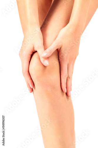 Pain in a knee, woman touches her knee, isolated on white backgr