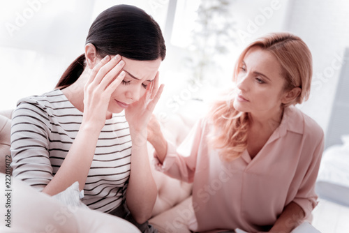 Painful thoughts. Unhappy emotional upset woman touching her head and closing her eyes while her attentive kind calm psychologist looking at her and finding necessary words