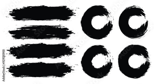 Paint brush strokes, ink splatter, and artistic design elements. Ink splashes. Grunge circle. High quality manually traced. Drops blots isolated. Vector isolated elements set.