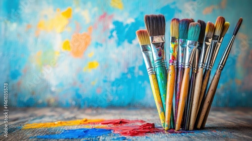 Paint brushes stand in colorful paint on wooden surface with blue backdrop. This is ideal for art blogs or creative workshops, designs, or illustration.