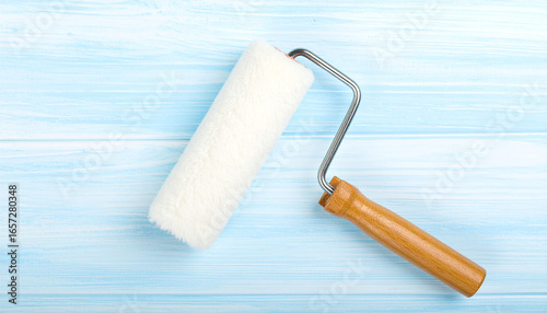 Paint Roller on Blue Surface: A clean paint roller rests casually on a soothing blue surface, perfect for renovation, painting, and design themes.