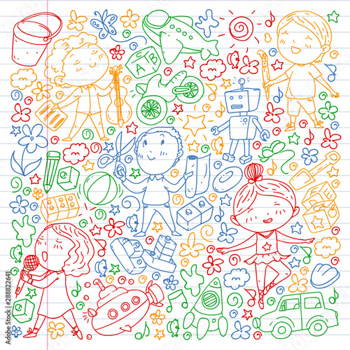 Painted by hand style pattern on the theme of childhood. Vector illustration for children design. Colorful drawing by pen on exercise notebook