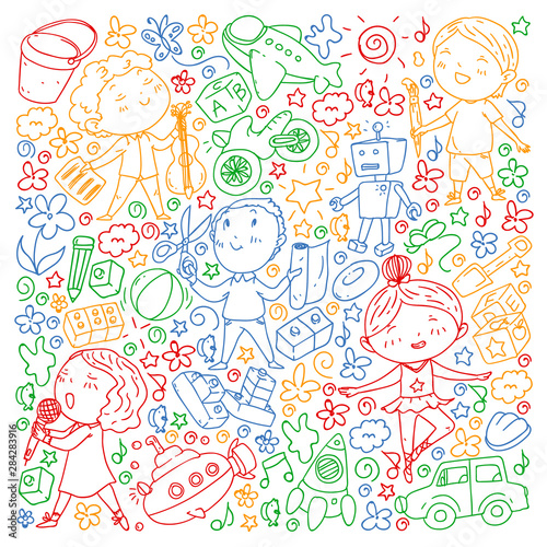 Painted by hand style pattern on the theme of childhood. Vector illustration for children design. Drawing on notebook in colorful style.