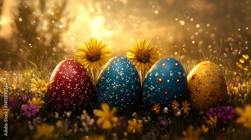 Painted Easter eggs in spring meadow with yellow flowers at sunset