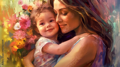 Painted image of a young mother holding her daughter in her arms, parenthood, mother's day