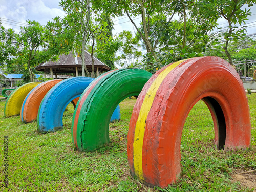 Painted tires are placed in lines which are used to create obstacles in the children's play area