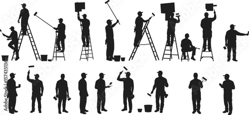Painter silhouette vector set, construction worker tools, painting wall, roller, brush, ladder, labor icons, handyman work illustration