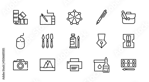 Painting and drawing linear icon set. Brush, graphic design, Spray, color palette, paint bucket, creativity, art work, paintbrush, repair, artist outline icon collection. UI thin vector icon