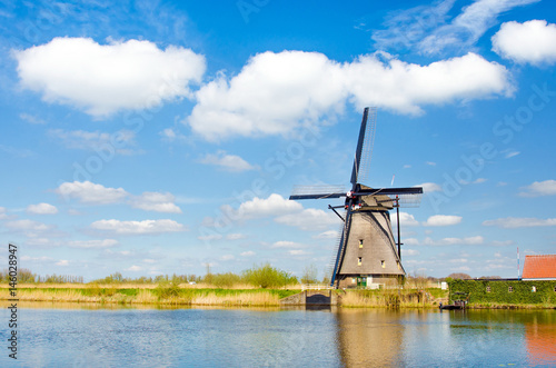 Painting beautiful picture of windmills in Kinderdijk, Netherlands, Europe against the backdrop of a cloudy sky.