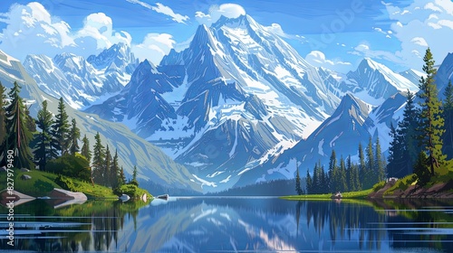 Painting of a mountain lake with pine trees surrounding it. Generative AI