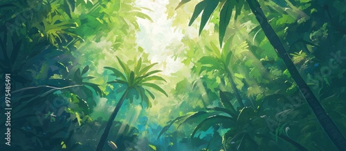 Painting of dark green leaf set against a lush jungle backdrop