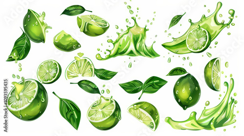 painting set of green limes splashing on white background