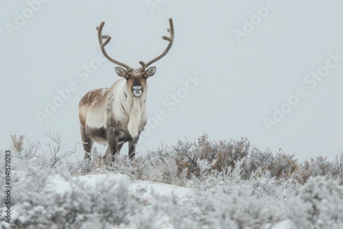 painting-A majestic caribou standing amidst a frosty tundra, against a pale gray backdrop