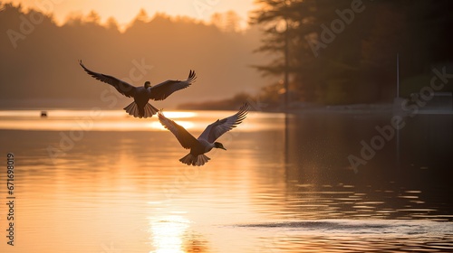 Pair of Birds Flying Over a Calm Lake at Sunrise. generative AI