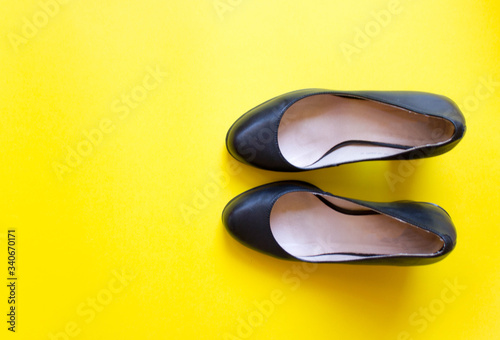 pair of black female shoes with toes on yellow background. free copy space. Overhead shot of elegant shoes. Top view, flat lay. Concept of fashion. Summer