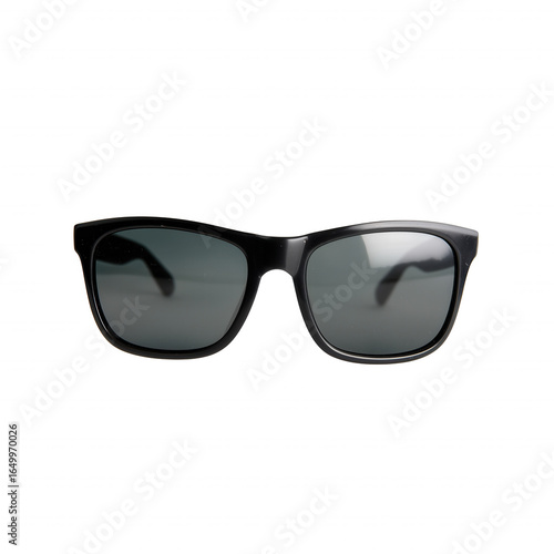 Pair of classic black sunglasses with rectangular frame on transparent background