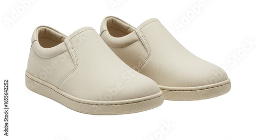 Pair of Cream Colored SlipOn Sneakers on White Background.