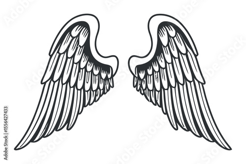 Pair of Detailed Angel Wings in Monochrome Style Black and white illustration two angel wings with intricate feather details angel wings wings angel