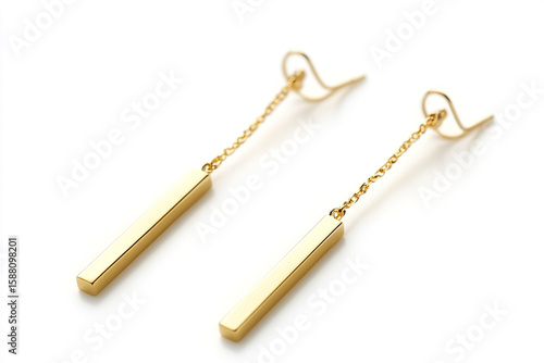 Pair of elegant gold bar earrings with delicate chains displayed against a bright white background for jewelry presentation.