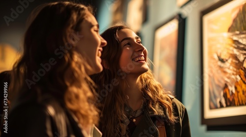 pair of friends sharing a moment of laughter amidst the profound atmosphere of an art gallery generative ai