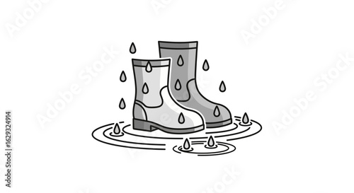 Pair of gray rubber boots standing in puddles with falling raindrops.