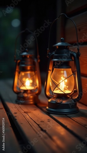 Pair of illuminated lanterns casting gentle light on aged wood surface , shadow, lanterns, rustic