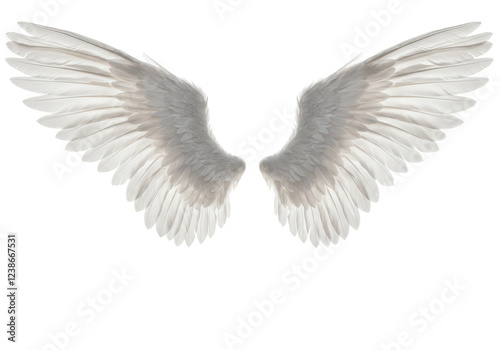 Pair of large white feathered angel wings, isolated on white background