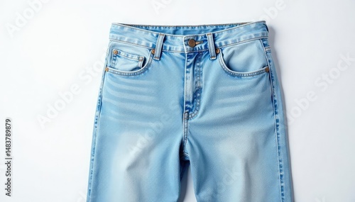 Pair of light wash jeans, pure white background, wear, stylish, clothing
