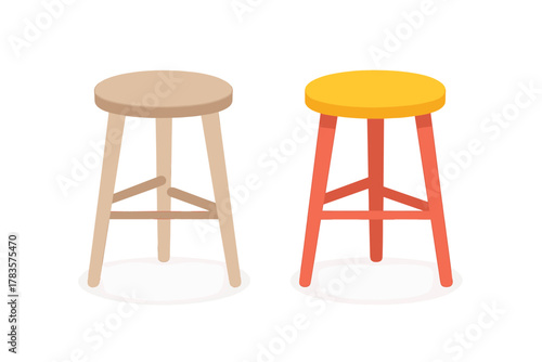 Pair of modern wooden bar stools featuring round seats, one natural beige and one vibrant orange and yellow