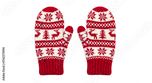 Pair of red and white knitted mittens with christmas pattern isolated on transparent background