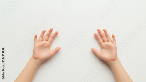 pair of small hands resting on white surface, showcasing delicate fingers and gentle posture. image evokes sense of innocence and curiosity