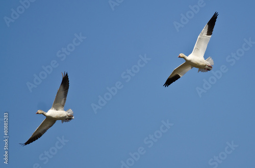 Pair of Snow Geese Flying in a Blue Sky