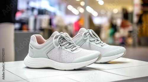 Pair of Stylish women's textile white sports shoes on a stand in front of a shoe store in a shopping mall. Generative AI