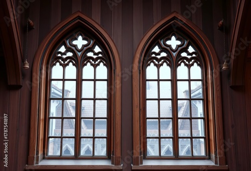 Pair of symmetrical, arched fachwerk windows with intricate timber framing, German, pair